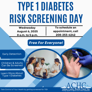 We are hosting a type 1 diabetes risk screening day! Type 1 diabetes is a chronic, autoimmune disease that can strike children and adults without warning. Screening and monitoring for type 1 diabetes can help you plan and avoid serious complications that can often accompany an unsuspecting diagnosis. Families and adults of all ages are welcome. This screening can be done on CHILDREN and ADULTS and is just a poke to the finger! It is available to anyone who would like to be screened for T1D, regardless of if you are a patient of ACHC. If you have not taken advantage of one of our FREE T1D screening days in the past, we encourage you to do so now by calling 208-253-4242 to schedule an appointment with ACHC’s exceptional T1D team! Make your appointment now by calling 208-253-4242.